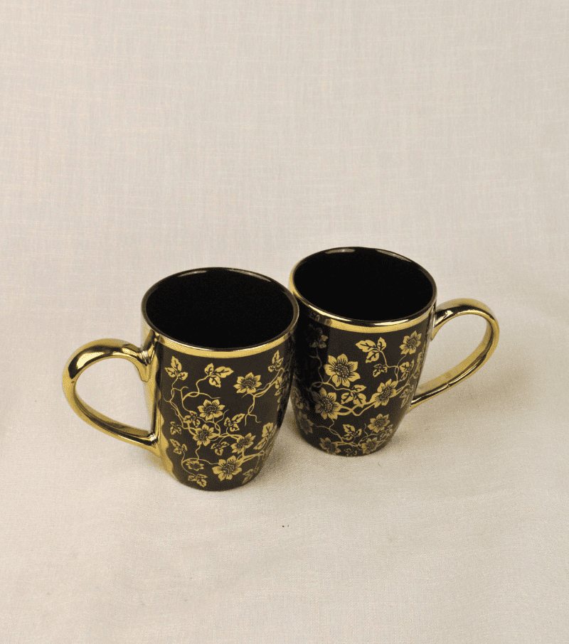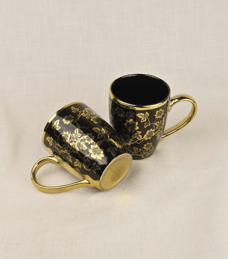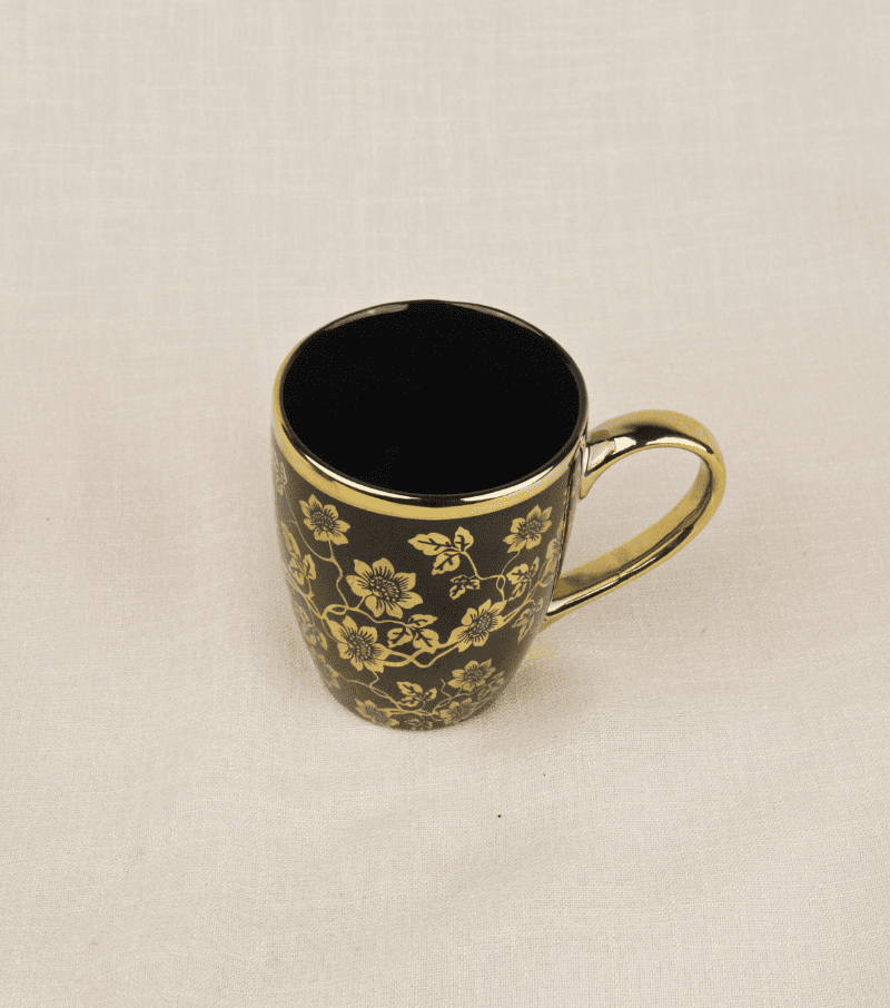 Morning brews, evening reflections, or indulgent moments—all feel elevated with the Golden Petals Mug. Its glossy black base adorned with intricate golden florals brings a touch of grandeur to every sip.