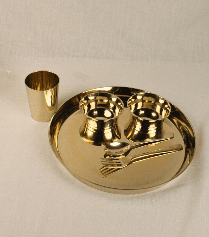 Renowned in Ayurveda for its health benefits, kansa is known to balance doshas and enhance digestion, making every meal not just nourishing but truly holistic. Designed for those who appreciate the harmony of design and wellness, this dinner set brings an earthy sophistication to your daily rituals and festive feasts alike.
