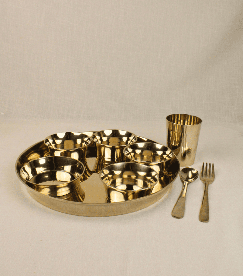 Includes: 1 Thali, 1 Glasses, 4 Katoris, 1 Meethai Katori, 1 Spoon, and 1 Fork