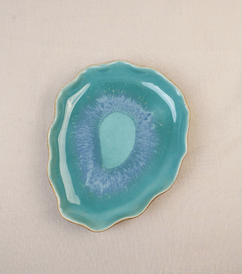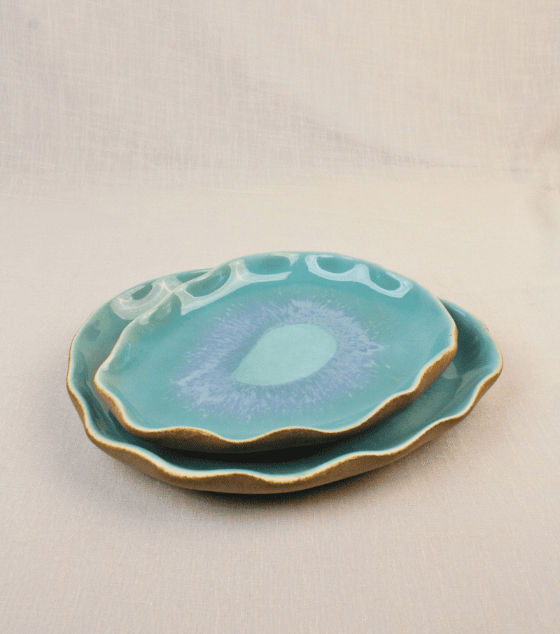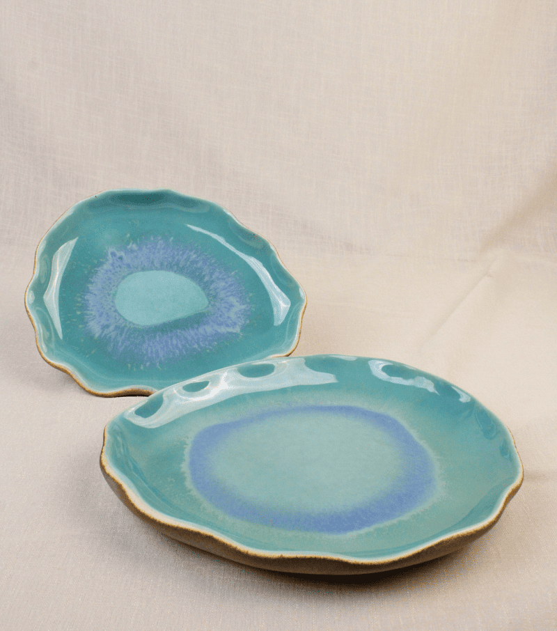 Each platter features a fluid, hand-formed design with soft gradients of blue and turquoise — reminiscent of sunlight dancing on rippling water. Perfect for serving appetisers, desserts, or even as a statement centrepiece, these plates are as versatile as they are artistic.