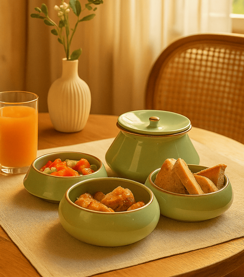 Blending traditional charm with modern design, the Sage Bloom Handi Basket is crafted for slow-cooked curries, rice dishes, or festive sides. Its openwork basket detail and serene colour palette make it a showstopper at any gathering.
