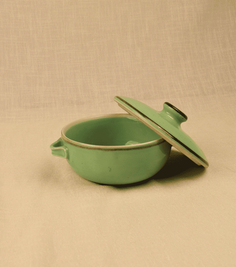 Rooted in tradition yet designed for the modern table, the Sage Bloom Rice Handi is where timeless flavours find their perfect home. Finished in a calming sage-green glaze with a rustic brown rim, this handi is ideal for serving biryanis, pulao, or slow-cooked curries. Its lid keeps aromas intact, while the handcrafted silhouette adds elegance to every meal.