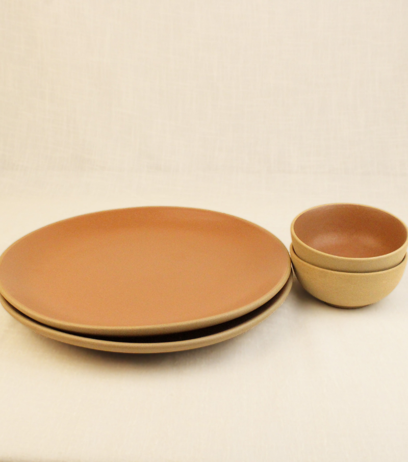 Comprising 2 dinner plates and 2 portion bowls, this set blends rustic charm with modern functionality, perfect for family meals or intimate gatherings.